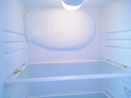 В холодильнике с независимым управлением температурой в камерах (два терморегулятора) в морозильном отделении образовался равномерный слой льда. При этом холодильник редко отключается, работает почти непрерывно. Вероятная причина образования наледи — выход из строя термодатчика воздуха морозильной камеры. Из-за поломки он ошибочно сообщает, что внутри морозилки недостаточно холодно, тем самым «заставляя» мотор морозить интенсивней. В результате морозилка обрастает снежной «шубой».